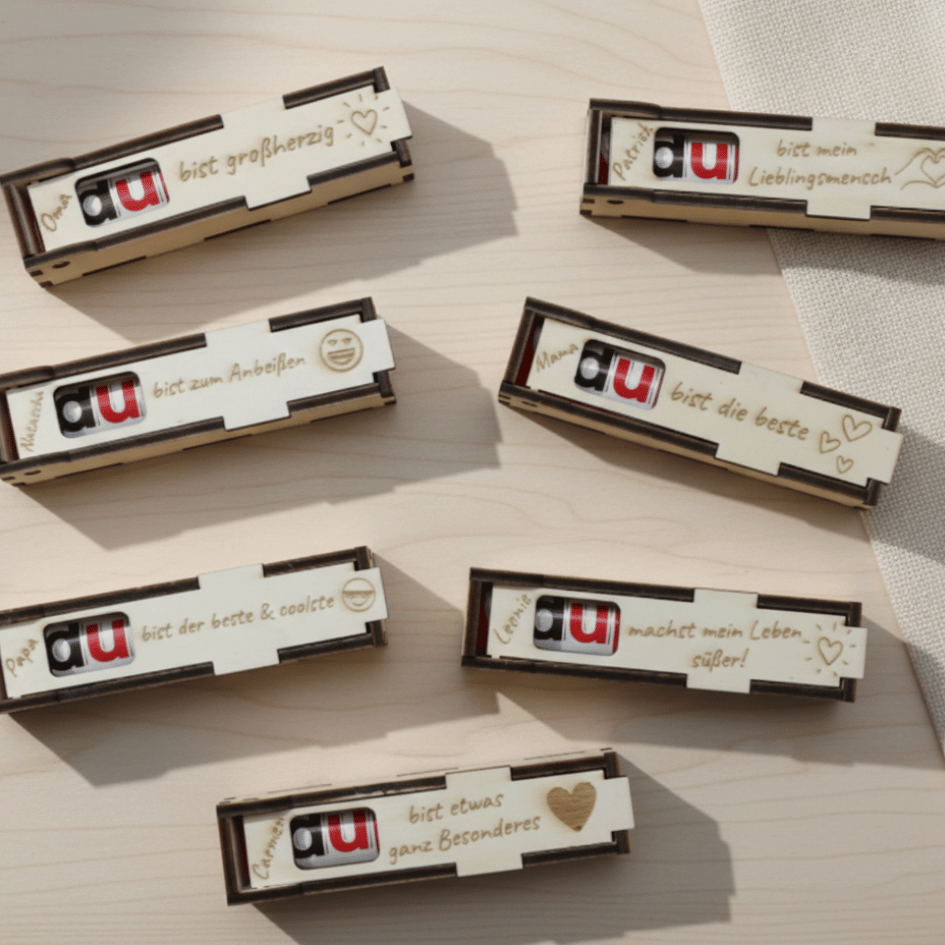 Die Holzbox wird individuell mit Namensgravur und Wunschtext personalisiert und macht jedes Geschenk zu etwas ganz Besonderem. Im Inneren befindet sich ein Duplo® Schokoriegel, sodass das Geschenk direkt fertig zum Verschenken ist.