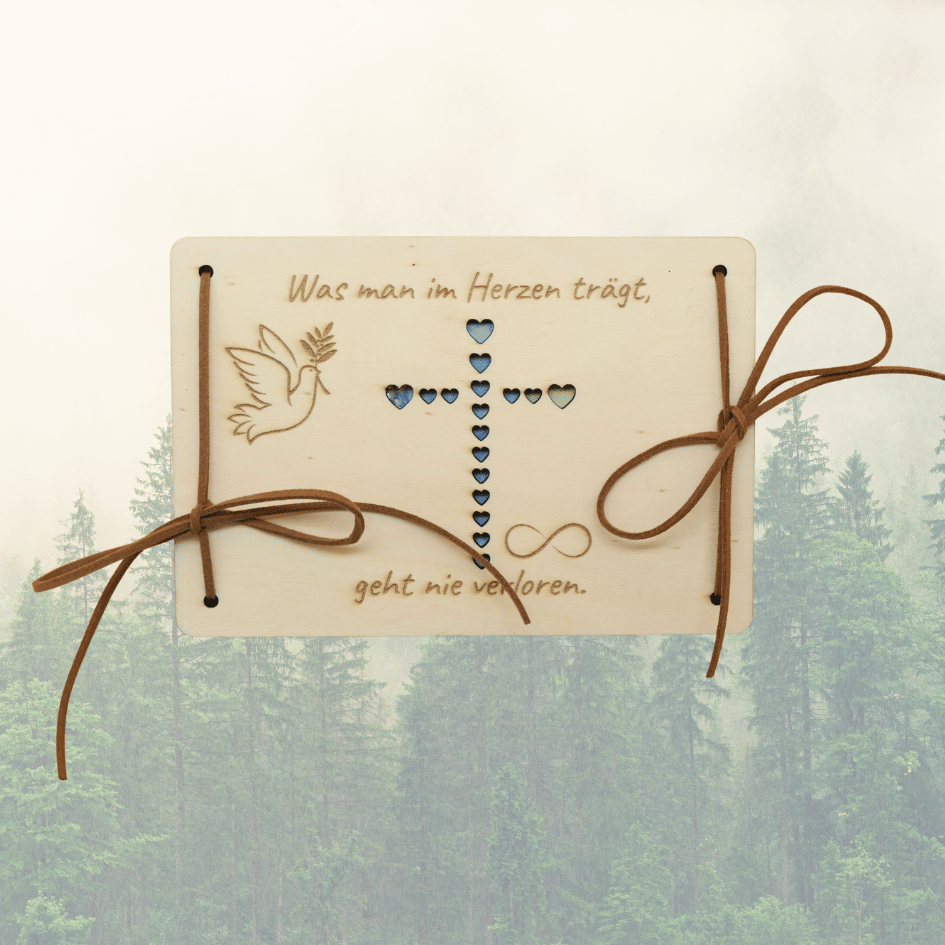 Personalisiertes Holz Geldgeschenk zur Trauer – Beileidskarte „Was man im Herzen trägt, geht nie verloren".