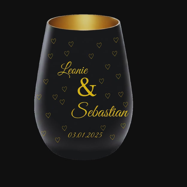 Dieses hochwertige schwarz-goldene Windlicht wird mit zwei Namen und eurem Jahrestag personalisiert und ist ein stilvolles Erinnerungsstück für gemeinsame Momente.